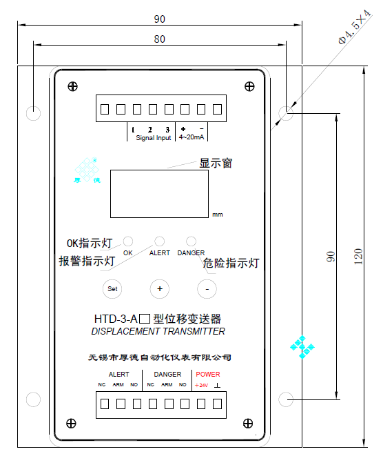无锡厚德HTD-3-A1三线制变送器,可适配各种线性差动变压器式传感器,如TD-2型热膨胀传感器、HTD系列位移传感器,UT-81系列油箱油位传感器等,内置激励源和差动测量电路,将传感器采集的数据在四位0.36英寸数码管上显示,并转换为4~20mA电流输出,以完成各种功能的位移或液位的测量。